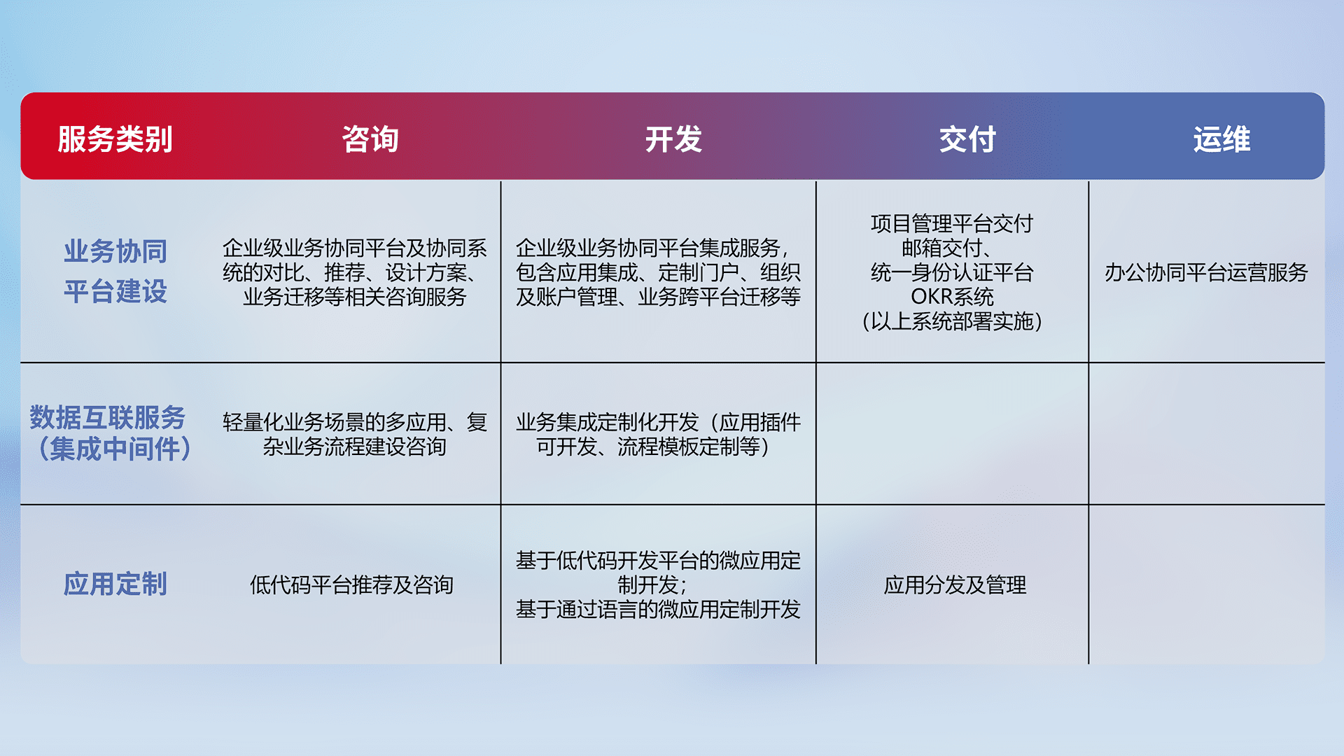 针对钉钉、、、企微、、、、IDaas等平台级产品提供产品的规划、、、方案、、、、交付、、、、定制化开发等服务,,,,实现如统一协同办公、、智能客户服务、、、、混合会议管理、、、、智能数据查询、、、、等业务场景,,,,实现数字化转型。。。