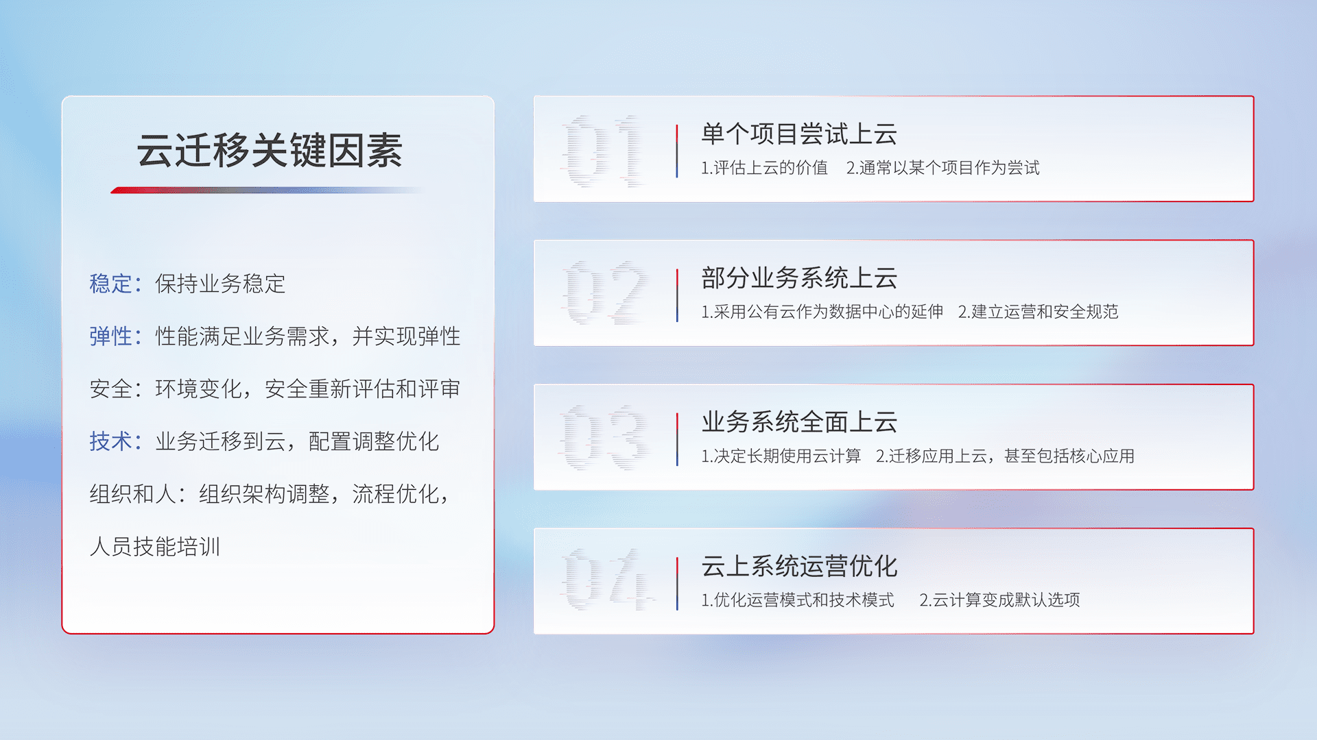 结合实际业务,,从规划设计、、、、云平台选型、、、、云原生改造、、、、数据迁移、、、集成交付,,,迁移全过程为客户识别最佳上云路径,,,做好风险识别管理,,设计网络架构、、、身份权限、、、、安全审计合规、、、操作审计、、、日志审计、、、监控告警策略、、多站点容灾设计等,,,对云上基础设施进行整体规划,,提升IT治理水平,,以满足弹性、、高可用、、、高性能的需求。。。。
