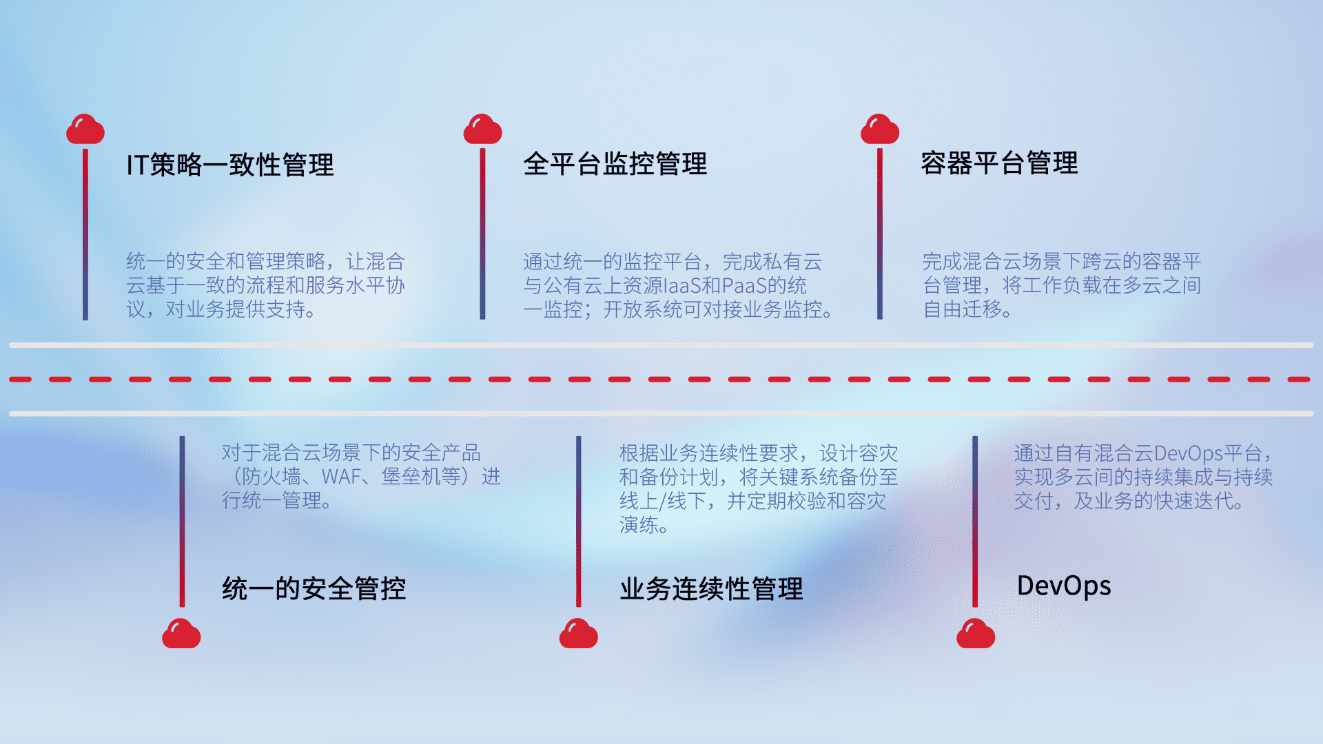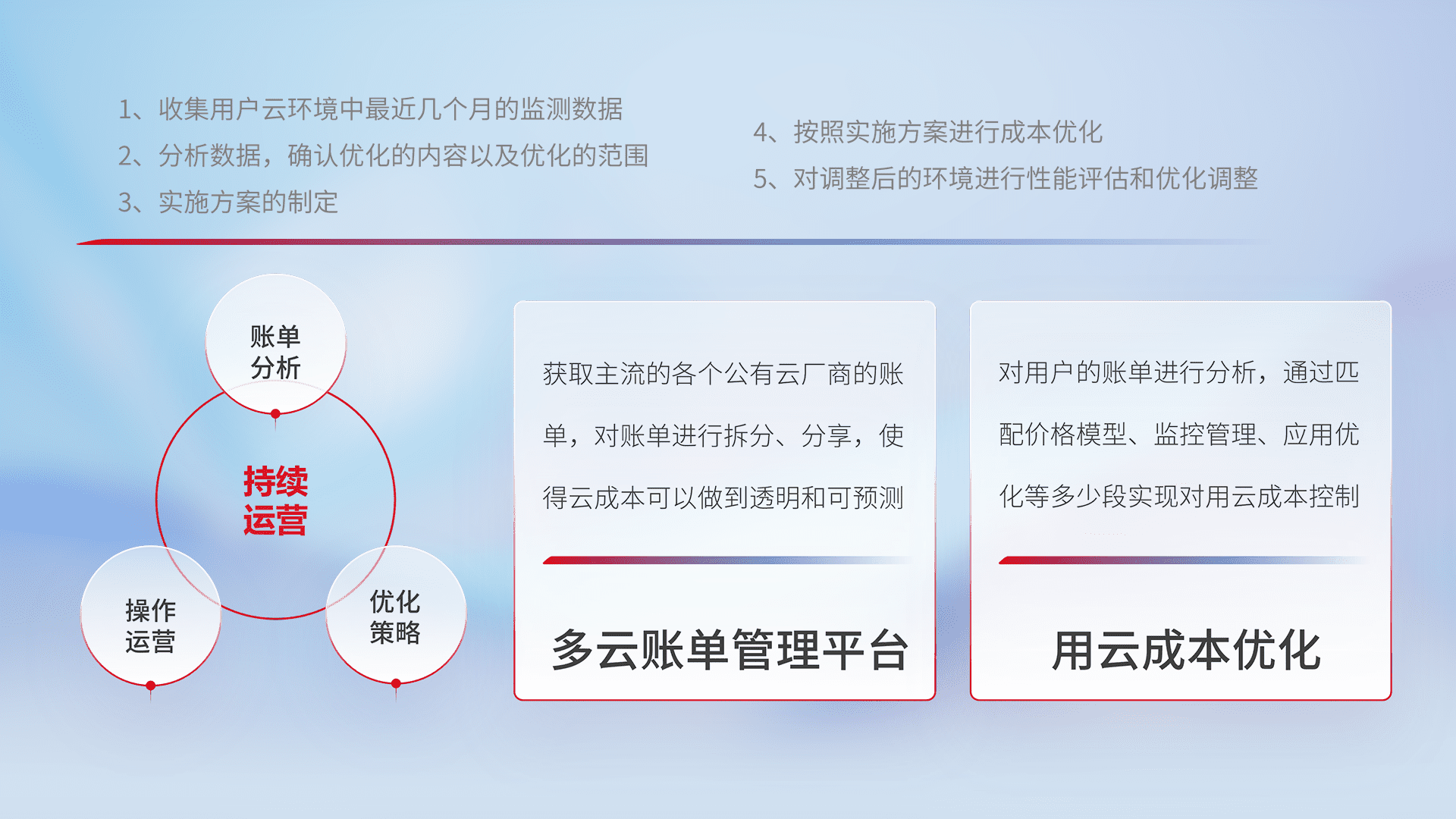 通过多云纳管,,,,以统一的资源数据模型把客户的云资源进行抽象和封装,,进而实现对多云资源的统一操作,,,,保障云资源管理的可靠性、、、、稳定性与可用性。。。量身定制化运维内容,,配置、、、开发运维、、、补丁管理、、、、备份、、监控、、认证和访问管理、、、、审计和日常巡检等,,,保障在用云过程中的可靠度,,稳定度以及高可用率。。。。